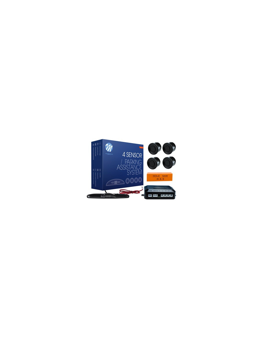 Sistema de asistencia de estacionamiento NEGRO de 4 sensores con una pantalla digital con un diseño moderno.