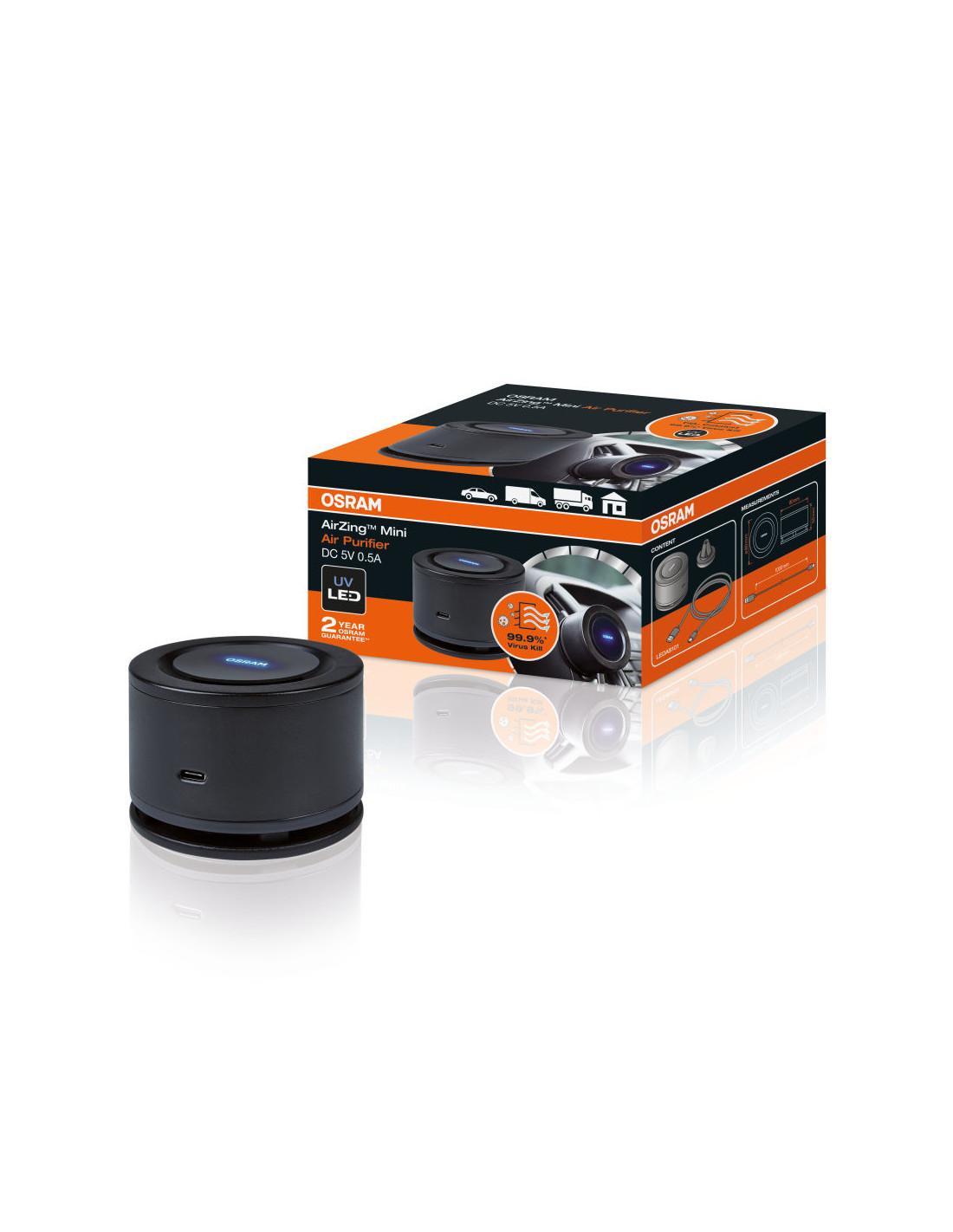 El AirZing Mini de OSRAM es una solución innovadora para ayudar a purificar el aire dentro de los vehículos. Utilizando los amplios conocimientos de OSRAM sobre la luz UV, el AirZing Mini aspira aire y lo filtra por una placa de dióxido de titanio que se combina con la luz UV-A para producir una reacción fotónico-catalítica. Esta reacción elimina las bacterias y virus dañinos del aire. El proceso de purificación también puede eliminar los olores y los malos olores dejando a los conductores con aire fresco y limpio.