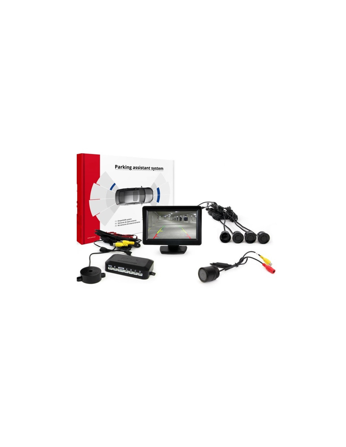 Kit de aparcamiento compuesto por: centralita- 4 sensores, 4 sensores ø 22 mm, altavoz, cámara de retro-visión con infrarrojos de diámetro 28mm - cámara moderna con función "Visión Nocturna"- con diodo adicional IR para iluminar. Pantalla TFT 4.3" de alta resolución en la cual se puede ver muy bien el entorno que se encuentra atrás de nuestro coche. Los sensores de aparcamiento son un dispositivo el cual ayuda al conductor aparcar seguramente el coche al momento de poner marcha atrás. Funciona como sonar: émite ondas ultrasónicas, las cuales al chocar con el obstáculo permiten declarar la distancia exacta de la cual se encuentra el coche. Mientras se retrocede el dispositivo reconoce el obstáculo en la vía y advierte al conductor por medio de sonido (sonido diferente dependiendo de la distancia en la que se encuentra el obstáculo) o por medio de la pantalla TFT.