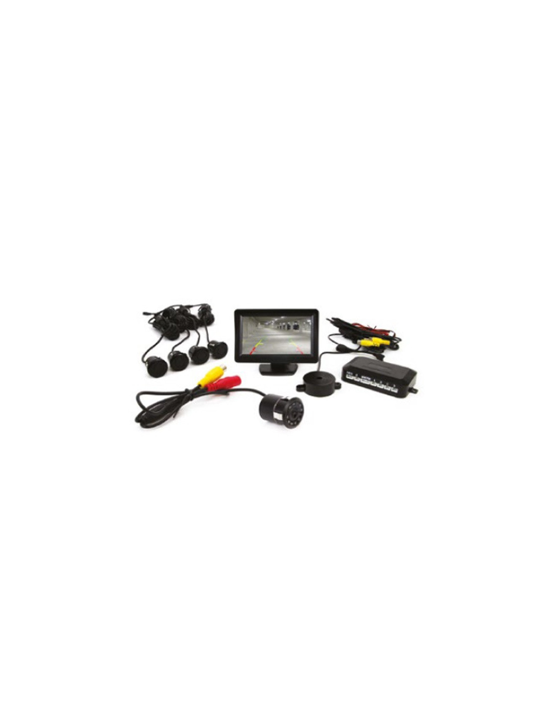Kit de aparcamiento completo compuesto por: centralita- 4 sensores, 4 sensores ø 22 mm, altavoz, cámara de retro-visión IR 18mm - cámara que puede ser montada en el parachoque del coche cómo sensor adicional. Pantalla TFT 4.3" de alta resolución en la cual se puede ver muy bien el entorno que se encuentra atrás de nuestro coche. Los sensores de aparcamiento son un dispositivo el cual ayuda al conductor aparcar seguramente el coche al momento de poner marcha atrás. Funciona como sonar: émite ondas ultrasónicas, las cuales al chocar con el obstáculo permiten declarar la distancia exacta de la cual se encuentra el coche. Mientras se retrocede el dispositivo reconoce el obstáculo en la vía y advierte al conductor por medio de sonido (sonido diferente dependiendo de la distancia en la que se encuentra el obstáculo) o por medio de la pantalla TFT.