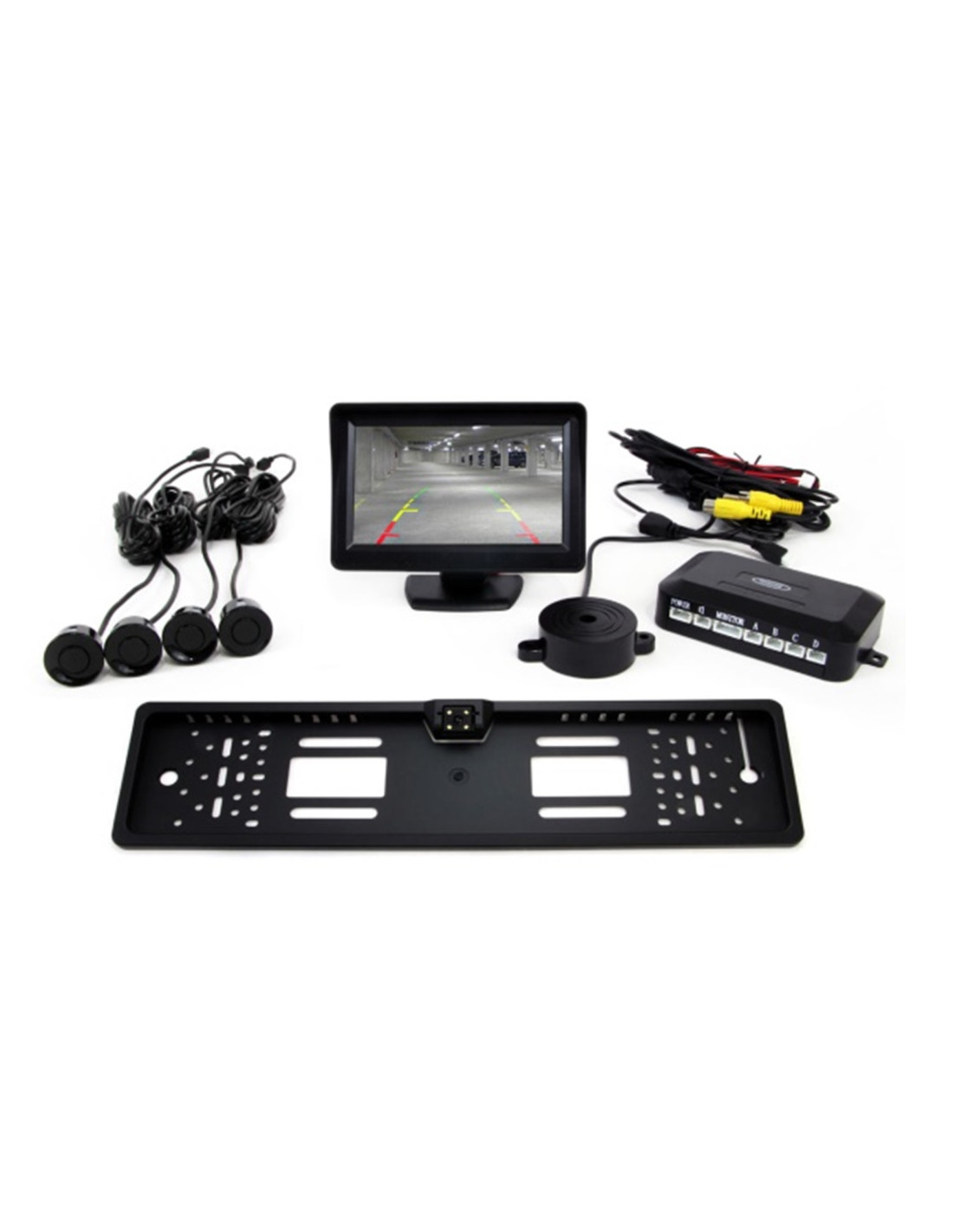 Kit de aparcamiento Completo compuesto por: centralita- 4 sensores, 4 sensores ø 22 mm, altavoz,cámara con marco para matrícula- posee iluminación LED, la cámara puede ser conectada al monitor con entrada de video. Pantalla TFT 4.3" de alta resolución en la cual se puede ver muy bien el entorno que se encuentra atrás de nuestro coche. Los sensores de aparcamiento son un dispositivo el cual ayuda al conductor aparcar seguramente el coche al momento de poner marcha atrás. Funciona como sonar: émite ondas ultrasónicas, las cuales al chocar con el obstáculo permiten declarar la distancia exacta de la cual se encuentra el coche. Mientras se retrocede el dispositivo reconoce el obstáculo en la vía y advierte al conductor por medio de sonido (sonido diferente dependiendo de la distancia en la que se encuentra el obstáculo) o por medio de la pantalla TFT.