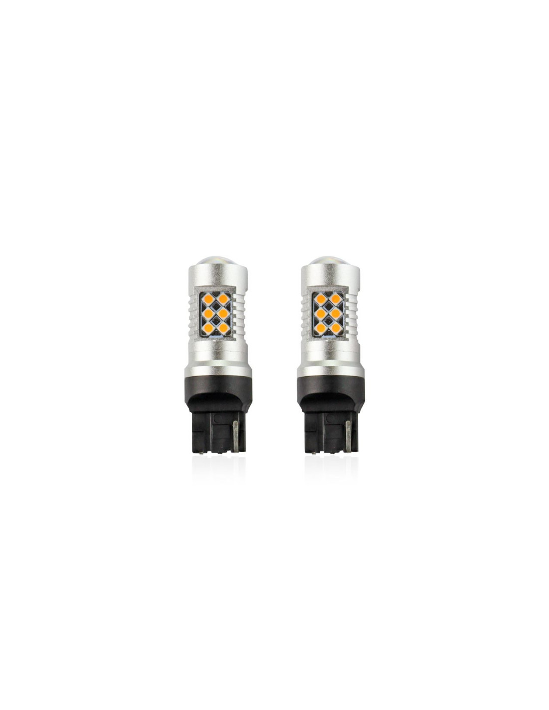 Estas dos bombillas de led can-bus T20 de un polo son en color ámbar para utilizar en intermitencia. Las podemos utilizar en los coches que llevan en origen bombillas de intermitencia de color ámbar de casquillo T20 W21W (12 voltios).