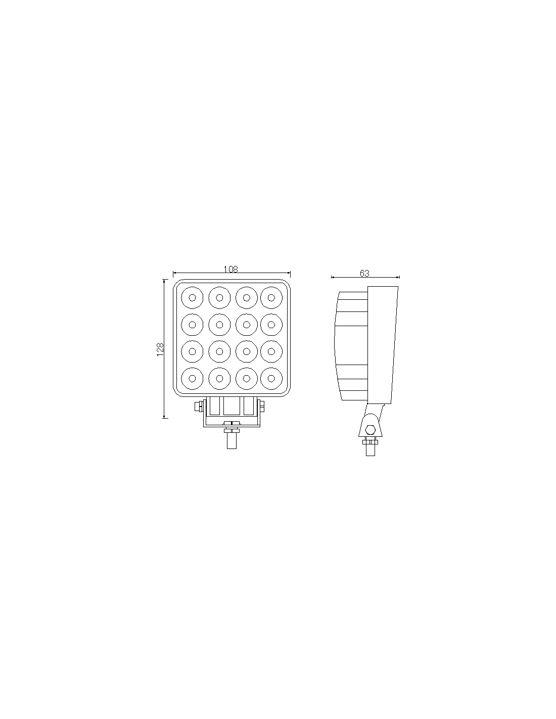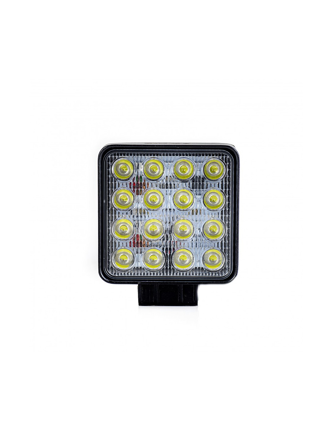 Lámpara de trabajo LED cuadrada con 16 LEDs y una potencia de 43W. Ofrece una iluminación potente y uniforme, ideal para aplicaciones en talleres y vehículos industriales. Fabricada con carcasa de aluminio y lente de policarbonato, es resistente al agua y certificada con IP67 y ECE R10.