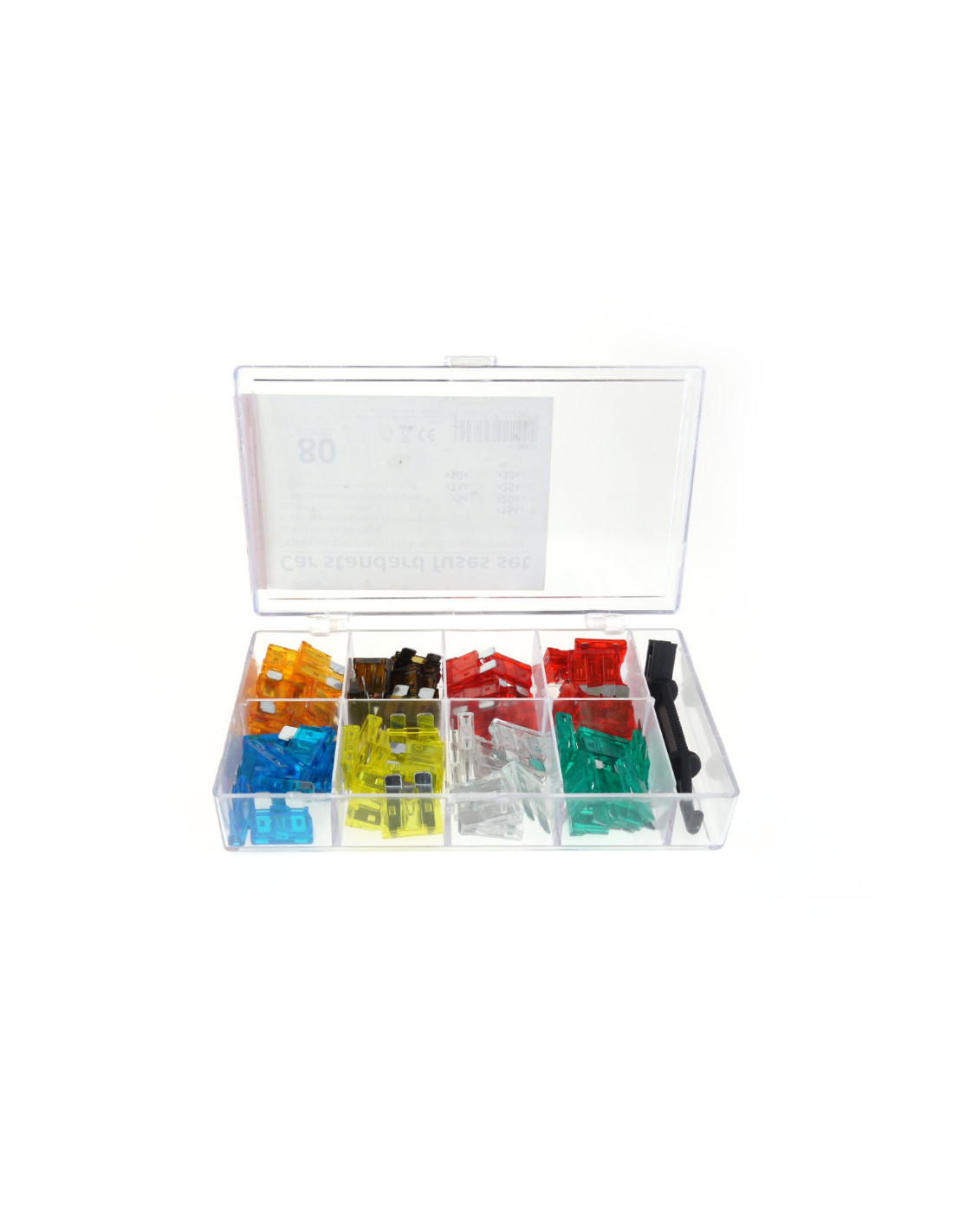Este kit lleva 80 fusibles estándar fabricados en alta calidad. Incluye además una pinza para fusibles. Los fusibles estándar incluidos en esta caja son: 10x5A, 10x7.5A, 20x10A, 10x15A, 10x20A, 10x25A, 10x30A.