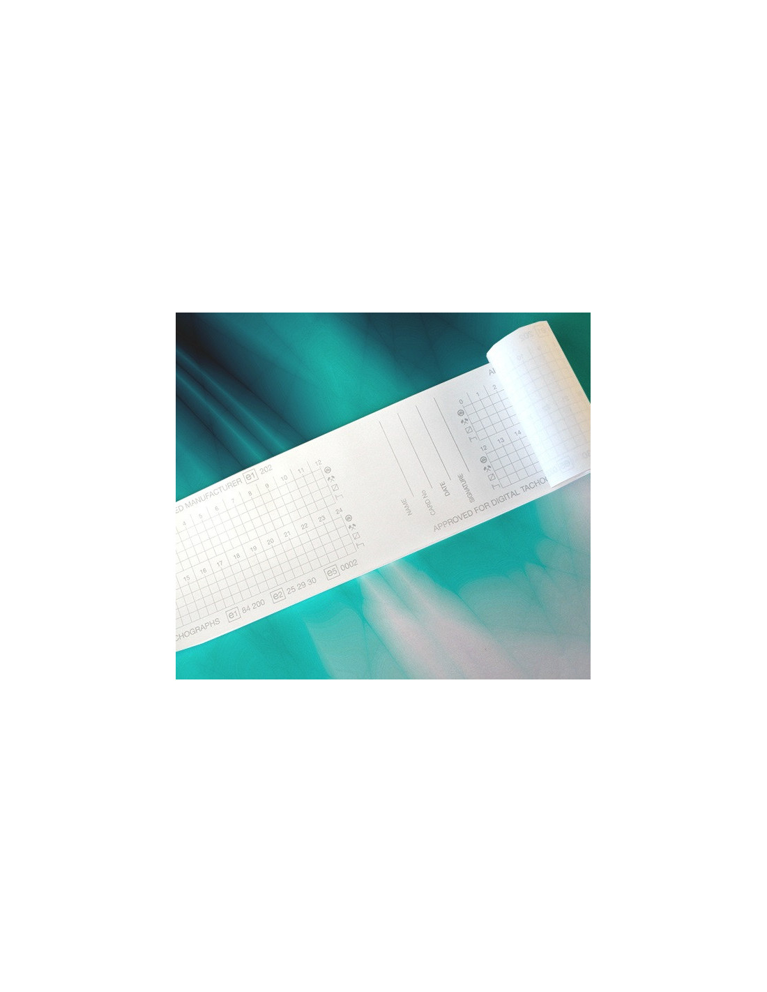Cada rollo de papel térmico está envasado individualmente en un film protector de plástico. El reverso de este papel térmico para tacógrafos digitales está preimpreso para permitir la entrada manual de datos.