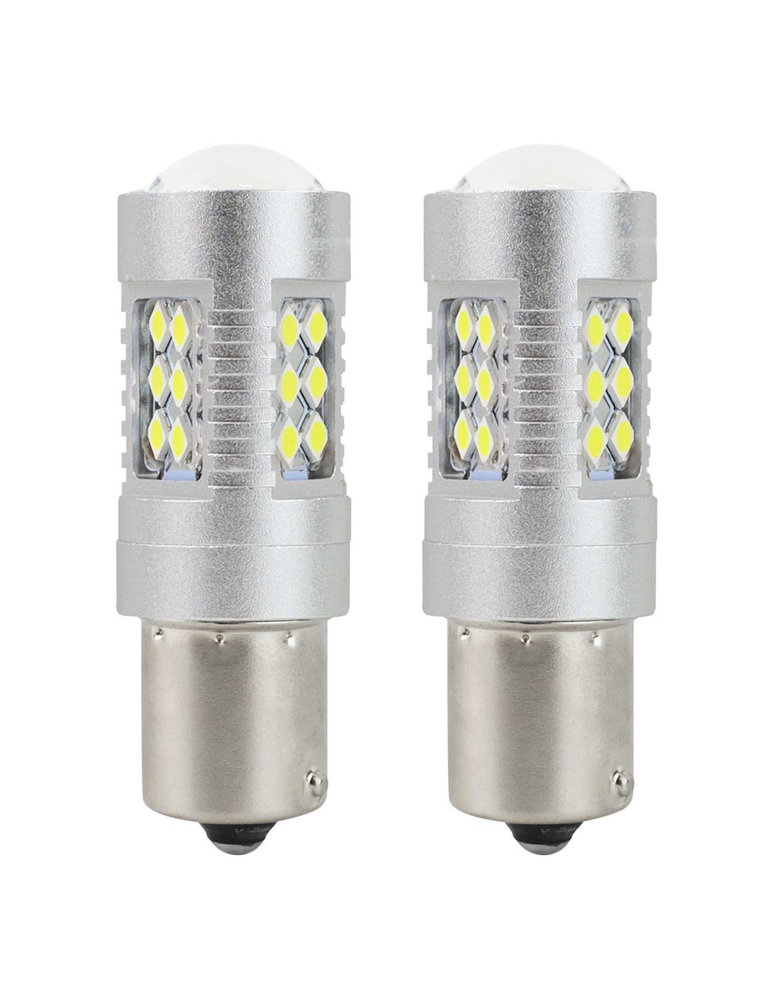 2 bombillas de led blancas de tipo un polo (BA15S P21W) con tecnología de can-bus para evitar el error de bombilla fundida. Cada bombilla tiene 24 leds de tipo SMD.