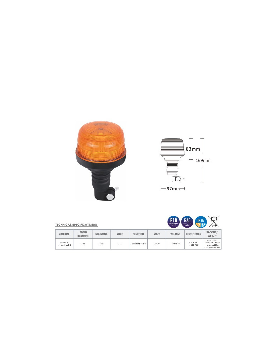 La lámpara led flash ámbar funciona a 12 y a 24 voltios. Tiene 24 leds y una potencia total de 25 watios. Su base de fijación es flexible y cuenta, por supuesto, con las homologaciones reglamentarias en la Unión Europea: