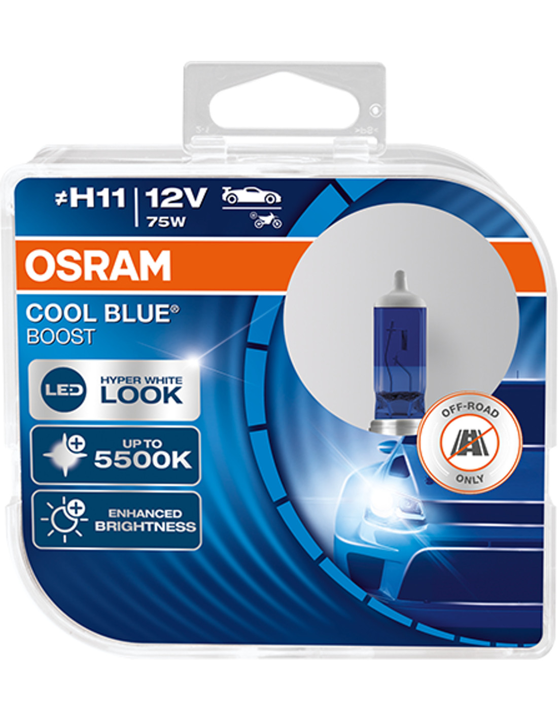 La familia de productos COOL BLUE® BOOST se distingue por su luz hiperblanca que imita la apariencia de los LEDs y alcanza temperaturas de color de hasta 5.500 K. Estas lámparas están diseñadas exclusivamente para uso fuera de carretera y no están homologadas para el uso en vías públicas.