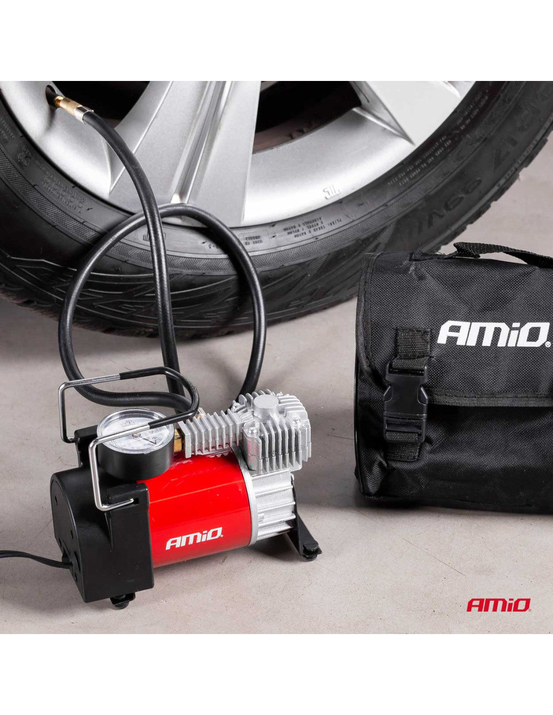 Compresor con mánometro para coche. Posee una carcasa metálica, sóida, la cual reposa sobre soportes de goma, las cuales nívelan las vibraciones emitidas durante el trabajo del compresor. Este dispositivo puede ser usado para inflar llantas, pelotas, boyas, piscinas, etc- posee tres boquillas diferentes. El compresor se lo puede conectar al encendedor de cigarriloos del coche.