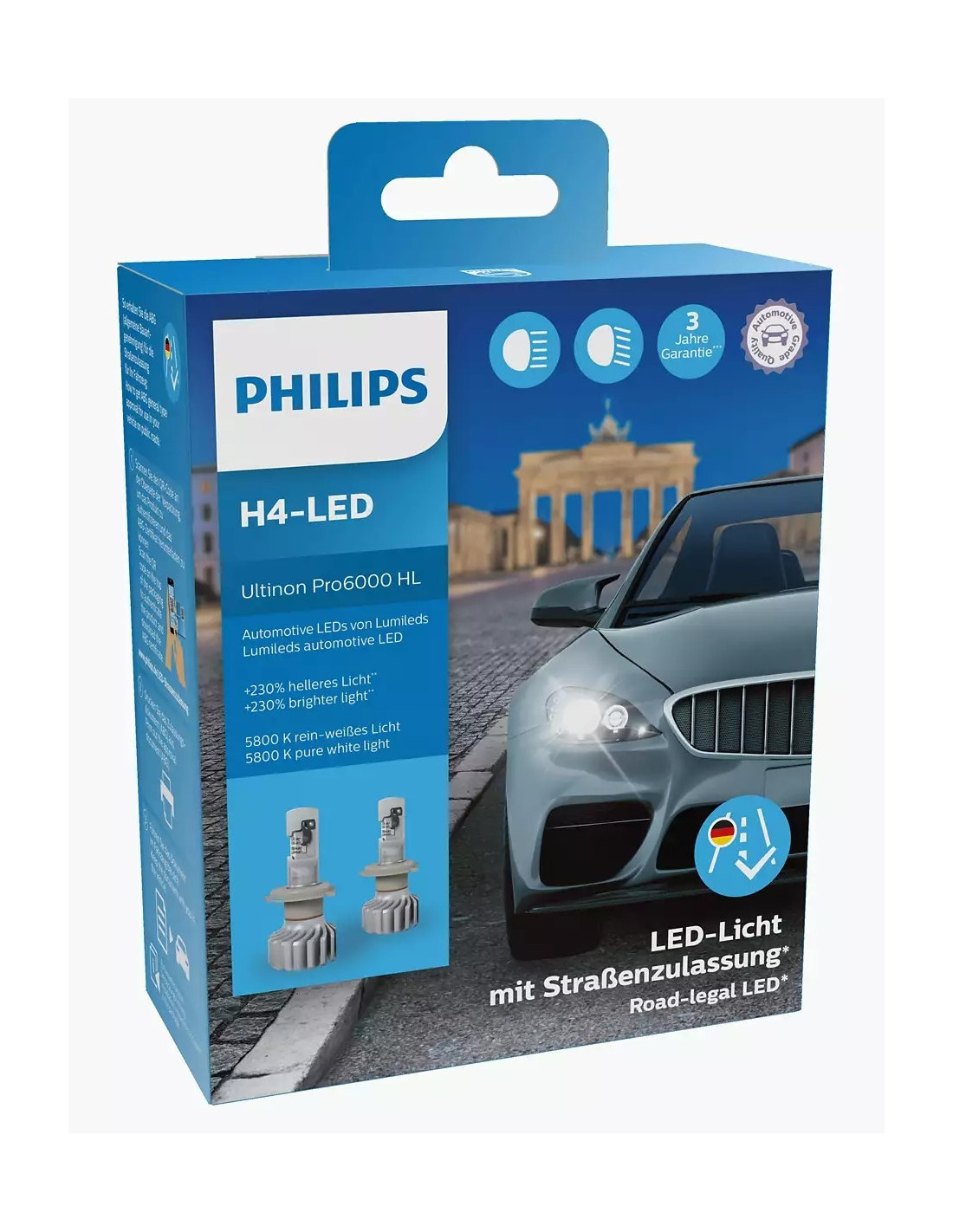 Lámparas de retroadaptación LED legales para calles** En iluminación automotriz de Philips, fuimos los primeros en el mundo, comenzando en Corea del Sur, en permitir el reemplazo de bombillas halógenas con bombillas LED modificadas legales para uso en la calle. Ahora obtiene esta experiencia con Philips Ultinon Pro6000, que fue aprobado por la Autoridad Federal de Transporte Motorizado (KBA) para modelos de vehículos seleccionados, también para el tráfico por carretera alemán. Mejore las luces altas y bajas de sus faros halógenos con nuestras bombillas LED modificadas Philips Ultinon Pro6000 aprobadas por seguridad y legales en la calle para obtener una apariencia nueva y sorprendente y una experiencia de manejo sin igual. Más información en www.philips.de/LED-Strassenzulassung |