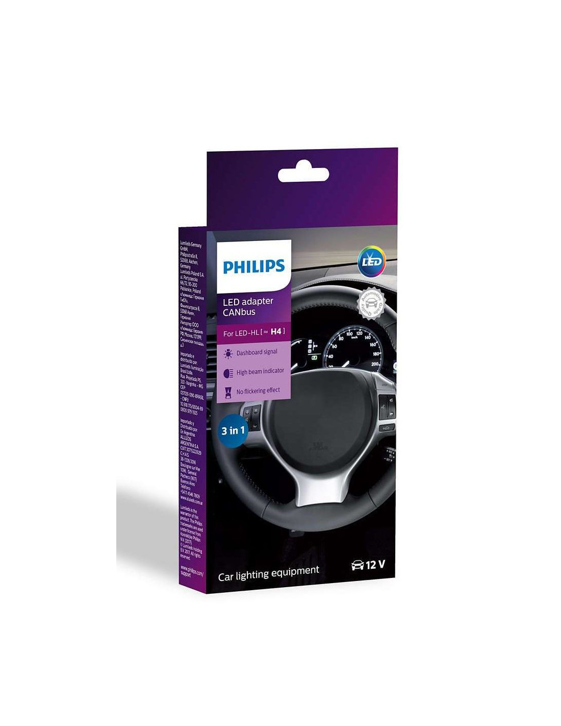Philips LED CANbus H4, 3 en 1, es el complemento ideal para los faros basados en LED H4. Fácil de instalar, garantiza un ajuste eléctrico perfecto con su automóvil, eliminando posibles problemas con la advertencia del tablero, los LED parpadeantes y la indicación de "luces fundidas".