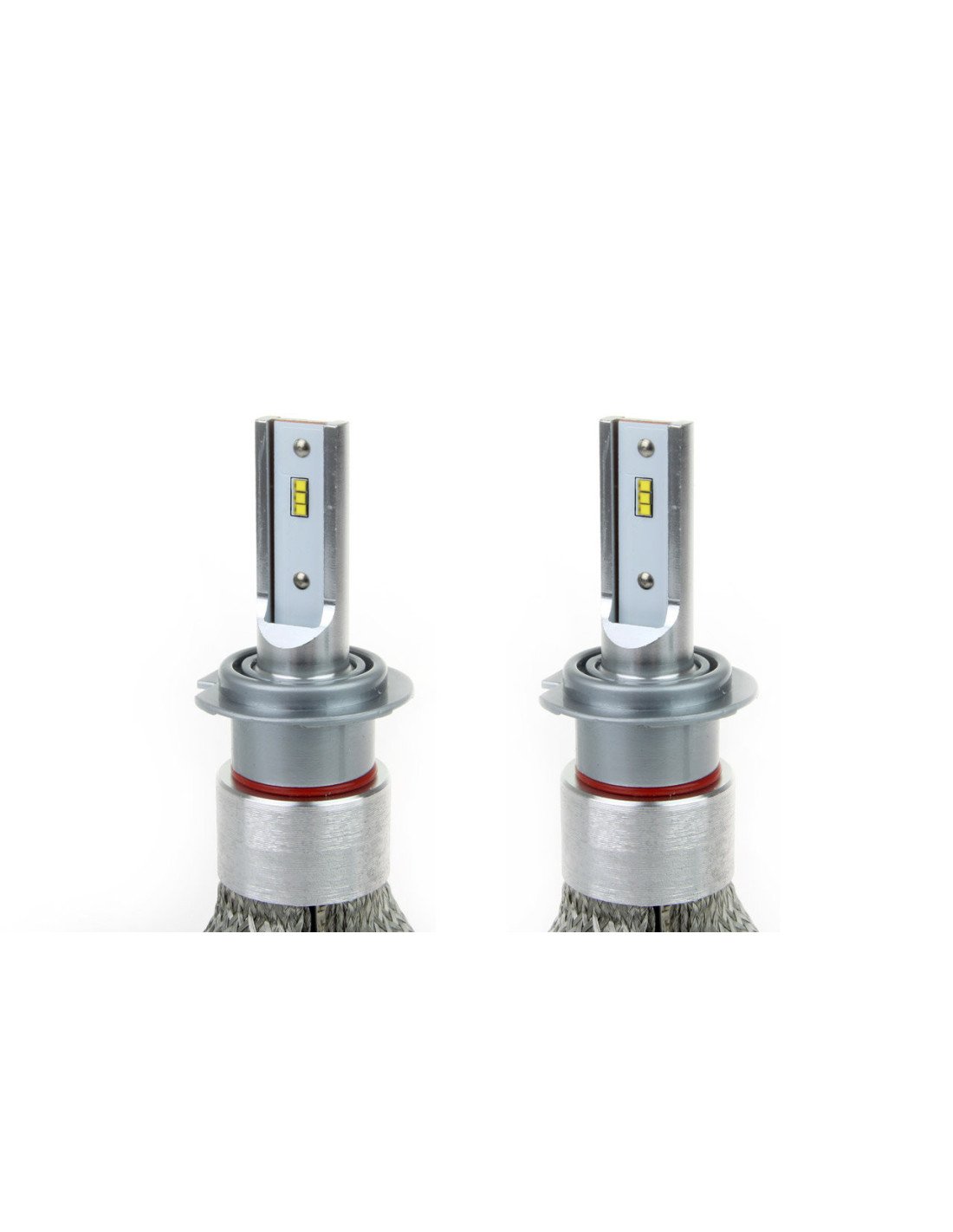 Kit de conversión a LED H7 de alta gama (con disipación de calor pasiva con tiras de aluminio) de la marca ATZ automotive para convertir la luz halógena amarilla original de nuestros faros a luz blanca pura de led. Con este kit, podremos instalar las bombillas en coches en los que tenemos muy poco espacio detrás de la tapa de los faros.