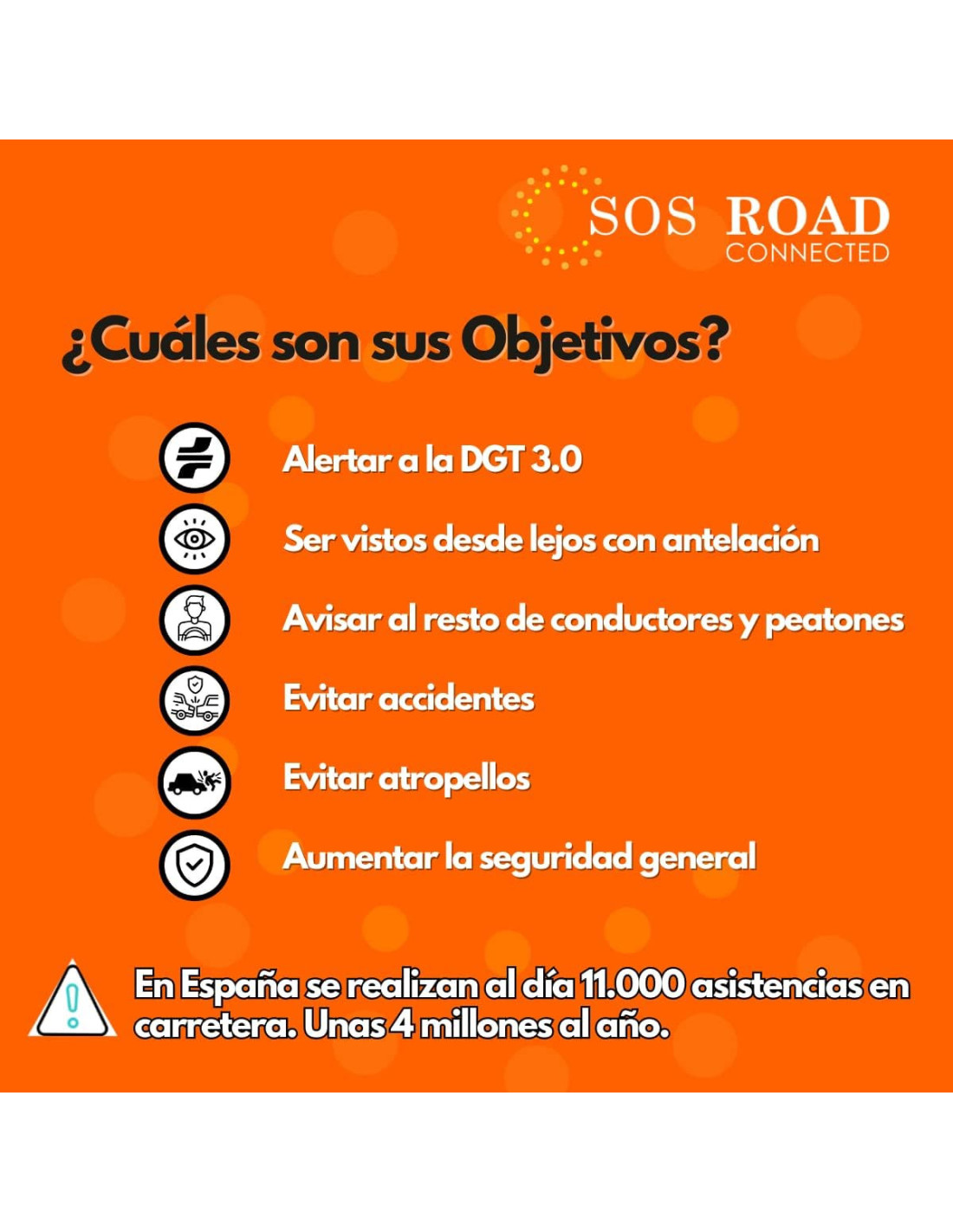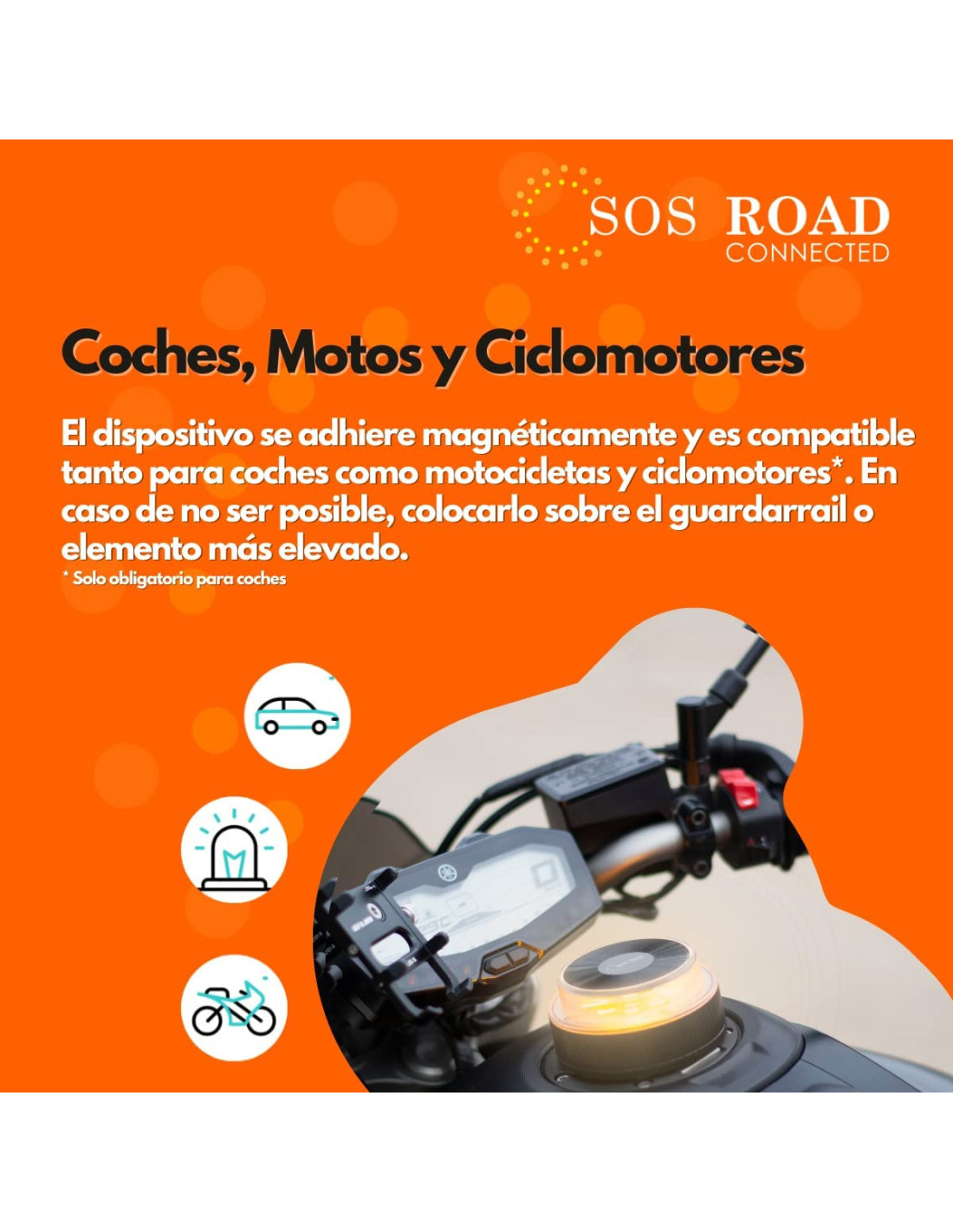 La SOS ROAD CONNECTED está diseñada para proporcionar seguridad tanto a conductores de automóviles como a motociclistas y ciclomotoristas, aunque para estos últimos no sea obligatorio el uso de señales luminosas V16. Su iluminación de 360 grados y sus 9 LEDs de alta intensidad garantizan que el vehículo sea visible desde cualquier ángulo, reduciendo el riesgo de accidentes.