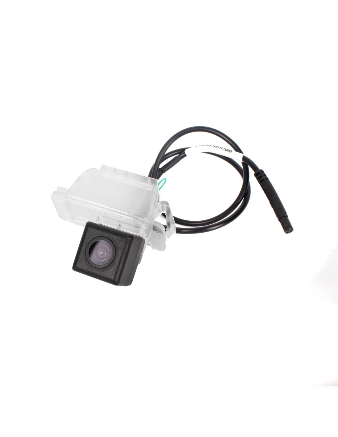 El cable de señal tiene una longitud de 6.2 metros y está equipado con un conector CINCH/RCA, lo que facilita la conexión a unidades de radio de mercado secundario con entrada AV RCA. La salida de video es de 1.0V / 75 Ohm, y el cable de alimentación tiene una longitud de 1 metro, con un suministro de 12V DC y un consumo inferior a 1W, lo que asegura un bajo impacto en la batería del vehículo.