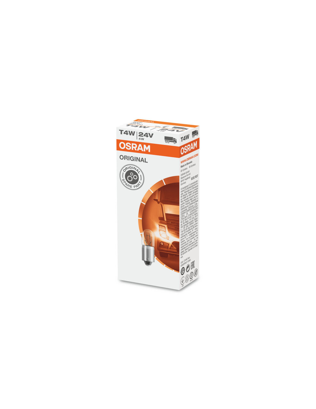 Datos eléctricos Consumo máximo de energía 5 W Potencia nominal 4 W Tensión nominal 24 V Tolerancia de entrada de potencia ± 10% Tensión de prueba (medición) 28.0 V Datos luminosos Flujo luminoso 35 lm Tolerancia de flujo luminoso ± 20% Dimensiones y peso Longitud 27,4 mm 8,8 mm de diámetro Peso del producto 2.01 g Durabilidad Durabilidad B3 550 h Tc durabilidad 1000 h Datos adicionales del producto Vástago (solución estándar) BA9s Certificados y estándares Categoría ECE T4W País - categorización específica Número de pedido 3930 Beneficios de usar el producto Calidad OEM Una amplia gama Calidad confiable Área de aplicación Posición y luz de estacionamiento Luz de dirección, luz antiniebla, luz de marcha atrás Luces de matrícula y luces de posición laterales. Características del producto Repuestos originales